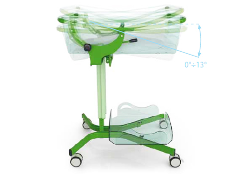 El sistema de soporte basculante de la pila cuna regulable milimétricamente, permite las posiciones llana, de Trend (-13°) y de contra-Trend (13°). La pila está realizada con material atóxico transparente termoformado, equipada con portaetiquetas frontal y de agujeros para la ventilación en el fondo.