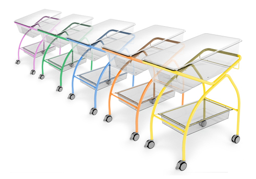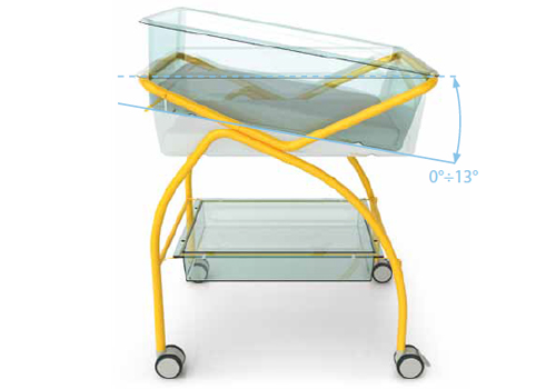 El carro sobre ruedas hermanadas, dos de ellas con freno, está equipado con sistema de soporte basculante de la pila cuna para la exposición del recién nacido y permite las posiciones llana, de Trendelenburg (-13°) y contra-Trendelenburg (13°) a través de la rotación de la pila.